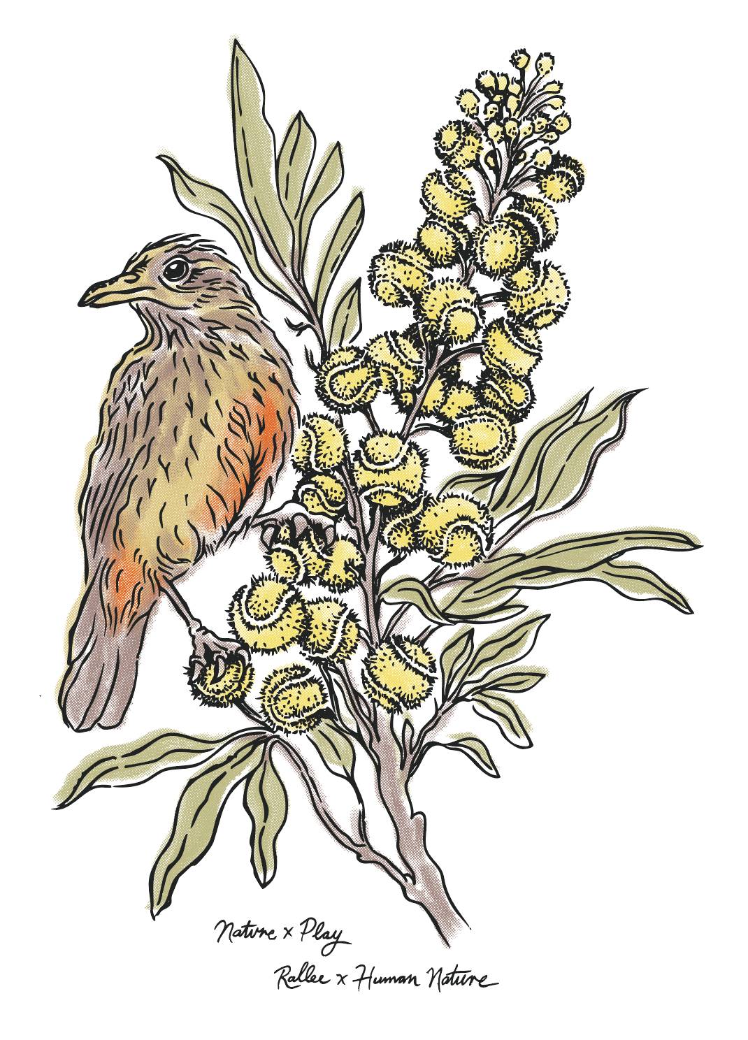 - Red Wattle Bird and "ball infused" wattle branch graphic